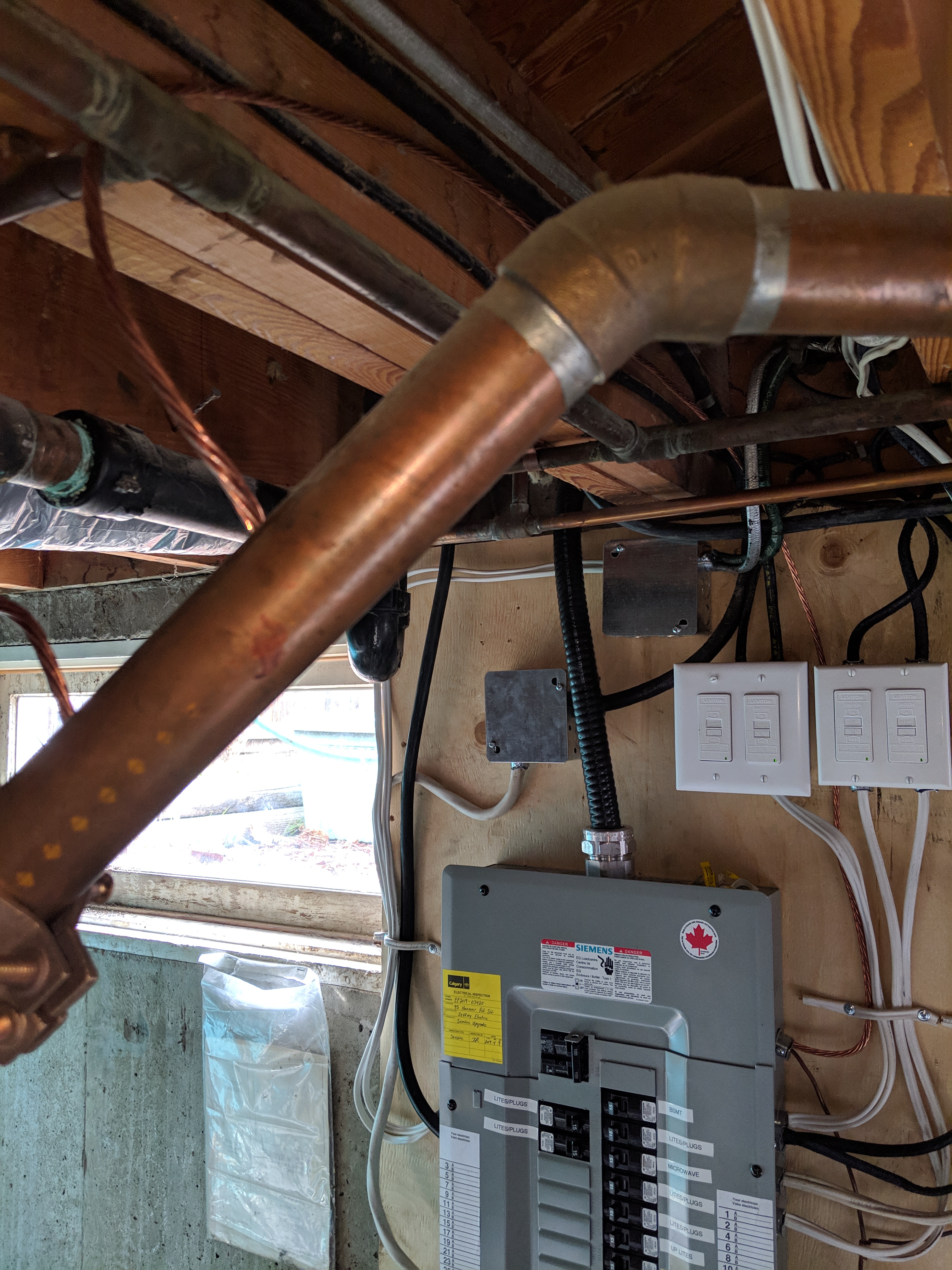 Upgraded electrical service from 60 amp to 100 amp. Proper ground fault protection of un-grounded wiring. One day changeover with Enmax and all permits.